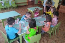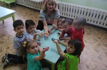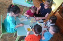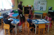 Тәрбияче Мухаметова Р.А балаларның рәсми сәләт ягыннан белемнәрен үстерү өстендә эшли. Дымка бизәкләре белән үрдәкне бизәргә өйрәтә (түгәрәкләр,туры һәм дулкынлы сызыклар,боҗра,нокта һәм борчаклар кулланып). Дымка уенчыкларының матурлыгын,бизәкләрнең төрлелеген,ачык матур төсләрнең килештереп ясалуны күрә белергә өйрәтә.