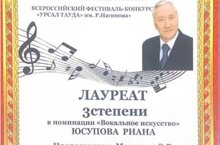Поздравляем ученицу 3 класса Юсупову Риану с 3 местом в номинации "Вокальное искусство" во Всероссийском фестивале-конкурсе "Урсал тауда"!