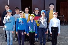 Возле памятника павшим в ВОВ учащиеся 2-4 классов провели репетицию выступления , которое состоится 8 мая