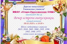 Дорогие выпускники!Уважаемые учителя!МБОУ «Старо-Уруссинская СОШ»приглашает Вас наВечер встречи выпускников,который состоится08.02.2020 г. в 18.00 чЖдем «юбилейные» выпуски2015, 2010, 2005, 2000, 1995, 1990,1985, 1980, 1975…годов и всех желающих - План на февраль 2020 г. 01.02.2020