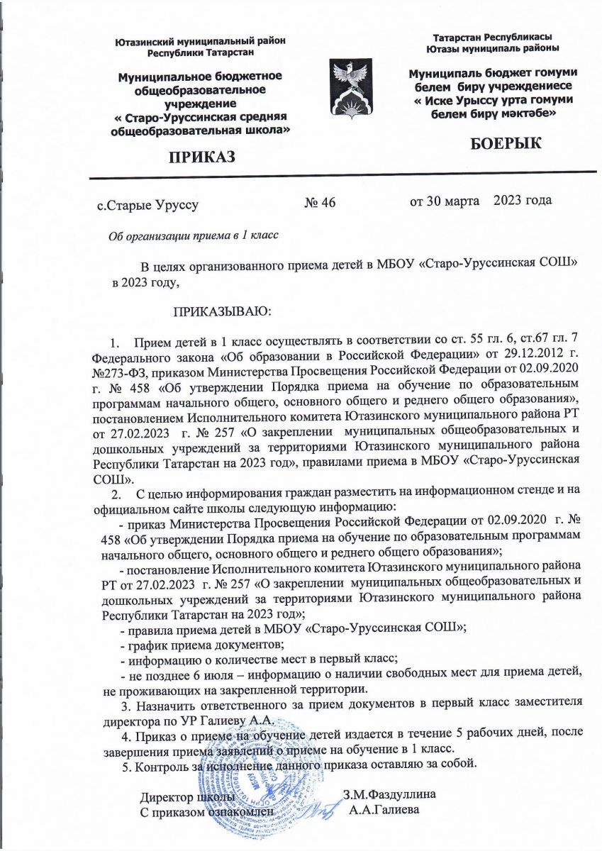 Приказ об организации приема в 1 класс на 2023-2024 учебный год