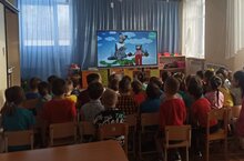 " Детский кинотеатр" Дети смотрят спектакль в интерактивной форме и учатся дружить, правильно вести себя с незнакомцами или на дороге.