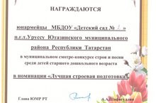 2 нче номерлы балалар бакчасы яшьармиячеләре «иң яхшы строй әзерлеге» номинациясендә өлкән яшьтәге балалар арасында строй һәм җыр смотр-конкурсында диплом белән бүләкләнәләр.