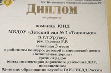2 нче номерлы балалар бакчасы командасы, җитәкчесе Гараева Р. Р., "Куркынычсыз юл" балалар һәм яшүсмерләр җырының район конкурсында 3 урын җиңү яулаганы өчен Диплом белән бүләкләнә