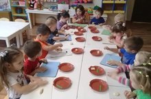Цель.Продолжать знакомить детей различными материалами для лепки и их свойствами, учить сплющивать и сдавливать шарики из теста. Формировать интерес к работе тестом. Развивать мелкую моторику, воспитывать гостеприимство.