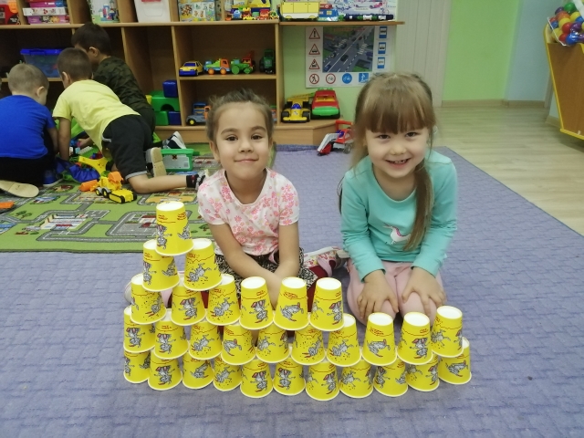Строим башню из бумажных стаканчиков. Цель: Развиваем конструкторские навыки, терпение, координацию рук, ориентировку в пространстве.