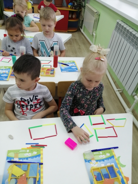 Продолжать закреплять умение составлять четырехугольники из счетных палочек. Упражнять в счете, в умении находить предметы заданной формы в окружающей обстановке.