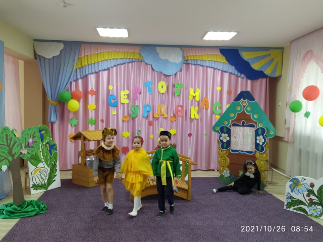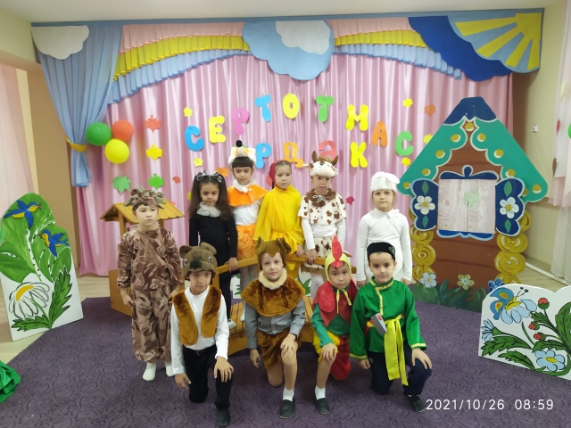 Цель: Развивать интонационную выразительность речи, добиваться правильного произношения. Совершенствовать активный словарь детей. Воспитывать творческую самостоятельность, артистические качества, любовь к театру. Учить чувствовать и понимать эмоциональное состояние героев (животных), уметь изображать их с помощью движений, мимики, жестов. Закреплять интерес к театрально-игровой деятельности. Воспитывать любовь к своим близким, к татарскому фольклору.