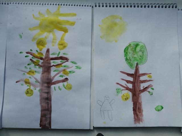 Рисование "Яблоня с золотыми яблоками в волшебном саду". Цель: учить создавать сказочный образ, рисовать развесистые деревья, передавая кроны фруктовых деревьев, изображать "золотые" яблоки. Закреплять умение рисовать красками. Развивать эстетическое восприятие, чувство композиции.