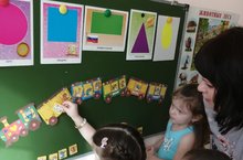 Цель: закрепления названия геометрических фигур, закрепление основных цветов, закрепление счета “один – много”.