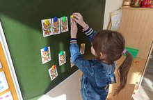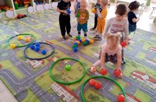 Цель:развивать умение детей объединять одинаковые мячи по цвету в группы.
