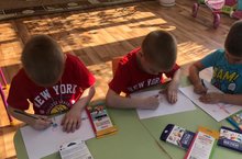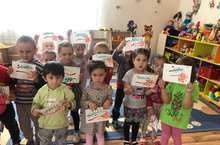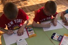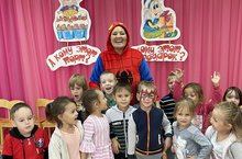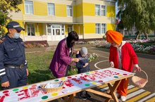 Далее герои мультфильма "Фиксики" Симка и Нолик предлагали родителям и детям помочь раскрасить буквы на плакате "Внимание Дети!". В конце мероприятия седлали общее фото с плакатом.