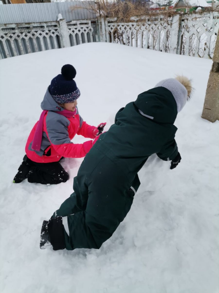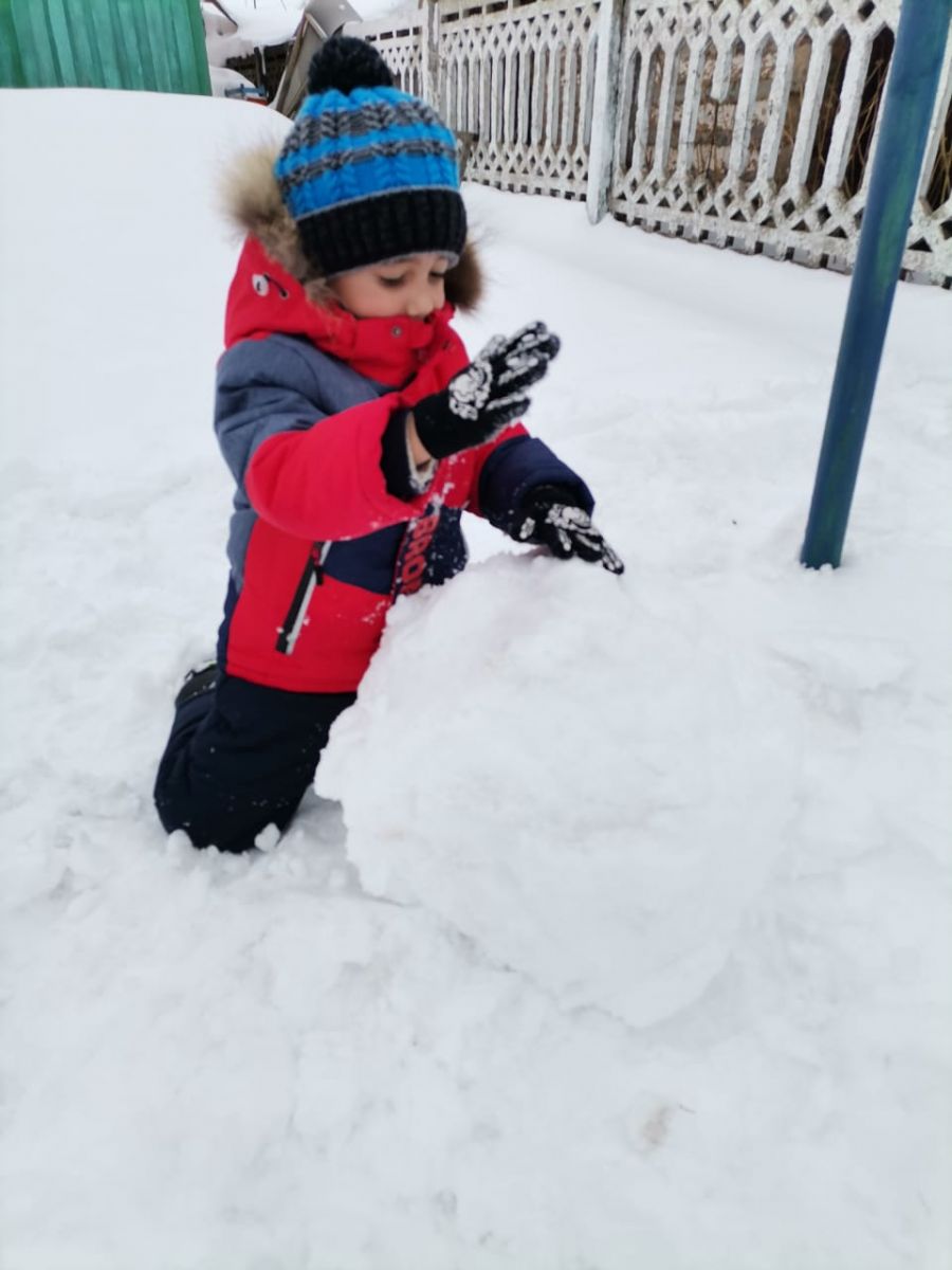 Лепит с самого утра Детвора снеговика. Снежные шары катает И смеясь, соединяет. Cнизу самый крупный ком, Чуть поменьше ком на нём. Ещё меньше – голова, Дотянулись мы едва.