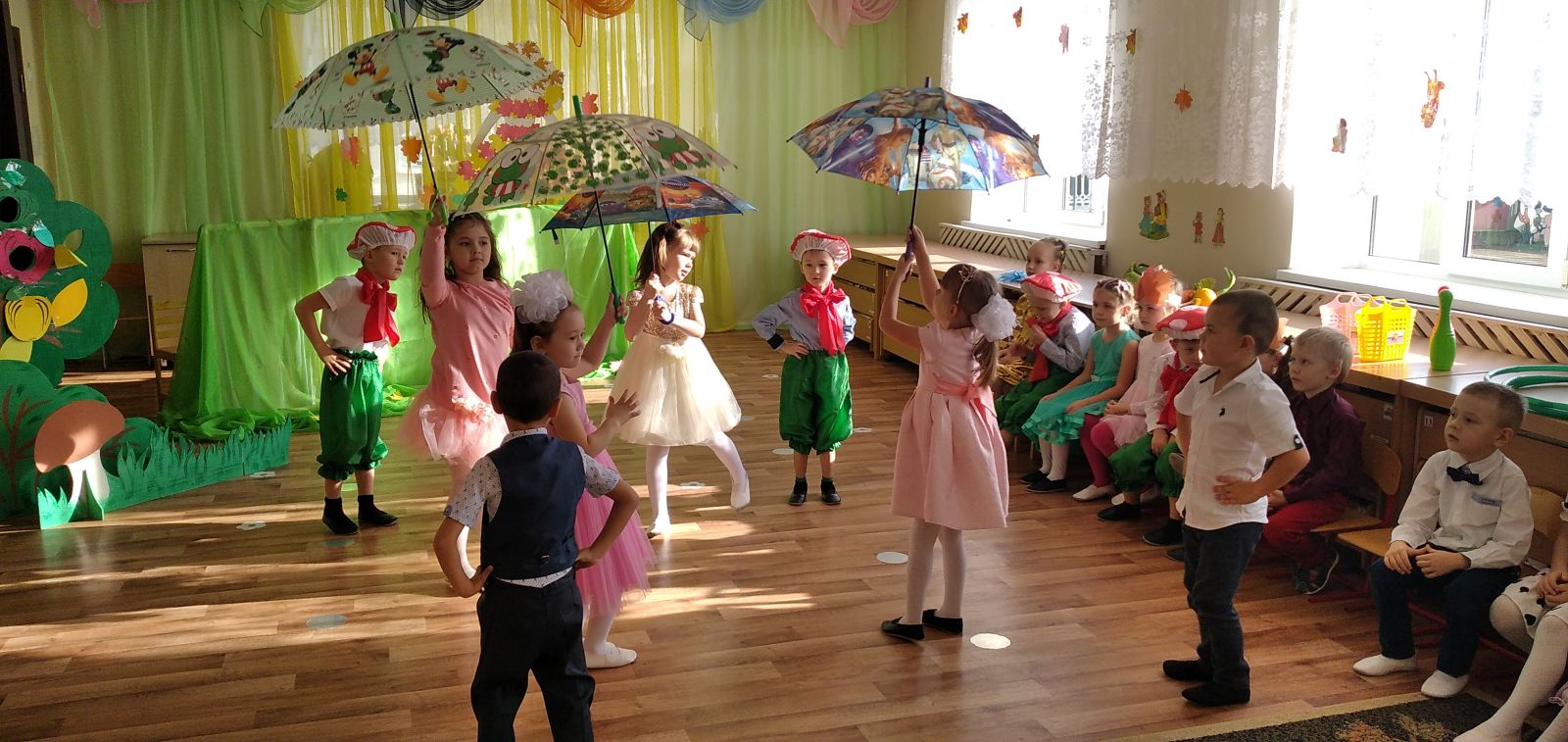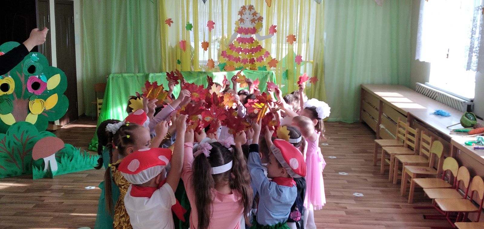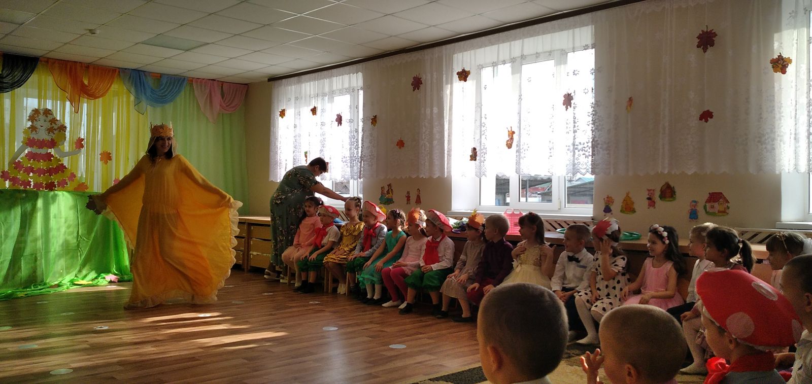 Традиционно, в октябре, в нашем детском саду проходят осенние праздники. У детей старше-подготовительной группы прошел осенний утренник. На дворе пасмурно и холодно, не хватает солнечного тепла, а у нас в музыкальном зале царила теплая, доброжелательная атмосфера. В гости к ребятам пришли грибочки, овощи и, конечно же, сама Осень-красавица заглянула на праздник, принесла гостинцы: яблоки и овощи. Дети с нетерпением ждали встречи с Осенью.