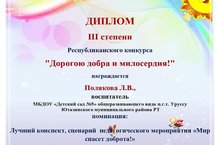 Республиканский конкурс "Дорогою добра и милосердия!". Номинация "Лучший конспект, сценарий педагогического мероприятия "Мир спасет доброта!". Диплом 3 степени!