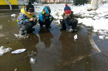 Воспитатель делает бумажные кораблики, дает потрогать детям, спрашивает, какие они (твердые, бумажные). Выносит на прогулку и дает детям. Дети пускают кораблики в лужу или ручеек. Наблюдают, как они намокают. Спрашивает, почему кораблики намокают.