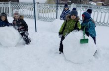 Сегодня теплый, зимний день. Снег липкий. Дети с огромным удовольствием лепили из снега снеговиков.