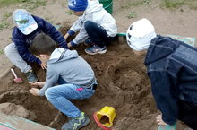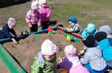 Малыши играют с песком. Цель: познакомить со свойствами песка.