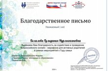 Благодарственное письмо за плодотворную работу с родителями. 26.03.2024