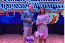 На торжественном мероприятии, посвящённом Дню физкультурника, учителю физической культуры гимназии Смоленцеву Г. Ю. вручили баскетбольные мячи по итогам школьного этапа Чемпионата ШВЛ "КЭС - БАСКЕТ"