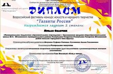 Мәктәбебезнең "Ямьле балачак" театр коллективы "Россия талантлары" Бөтенроссия сәнгать һәм халык иҗаты фестиваль - конкурсында 2 дәрәҗәле лауреат исеменә лаек булды.