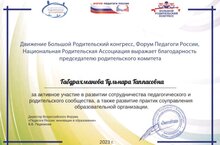 Благодарственные письма и сертификаты Первого Всероссийского марафона для активных родителей и глав родительских комитетов. (В лице председателя общешкольного родительского комитета Габдрахмановой Гульнары Гаппасовны)