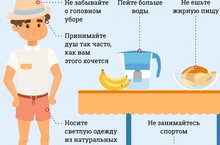 - избегайте физических нагрузок, носите легкую и свободную одежду из натуральных тканей, широкополую шляпу или кепку и солнцезащитные очки;