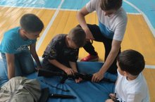 Сегодня в пришкольном лагере "Лучик" военно-спортивная эстафета, которая организована при участии юнармейцев-старшеклассников. Ребята попробовали свои силы в разборке-сборке автомата, устройстве противогаза, наведение переправы, перемещению по бревну.