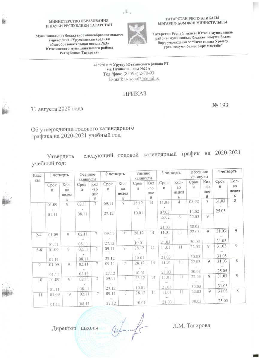 Календарно-учебный график школы на 2020-2021 учебный год
