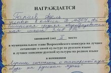 Гараев Адель ученик 8»Б» класса занял 2 место в муниципальном этапе Всероссийского конкурса сочинений о своей культуре на русском языке. Подготовила конкурсанта учитель русского языка и литературы Хасанова Милеуша Радиковна. Поздравляем! Молодцы!