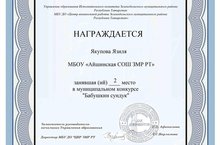 Күптән түгел мәктәбебезнең 5нче сыйныф укучысы Якупова Язилә (укытучы Бачкова Э.В.) ТАССРның 100 еллыгы уңаеннан оештырылган “Әбием сандыгы” исемле бәйгесендә катнашты. Бәйге туган телебезне, халкыбызның гореф – гадәтләрен, мәдәниятен өйрәнү һәм саклау максатыннан үткәрелде. Язилә “Әбиемнең күңел сандыгы” дип исемләнгән номинациядә үзенең иҗади эше белән катнашып, II урынга лаек булды. Аны шушы җиңүе белән чын күңелдән котлыйбыз. Алдагы иҗади эшләрендә дә уңышлар теләп калабыз.