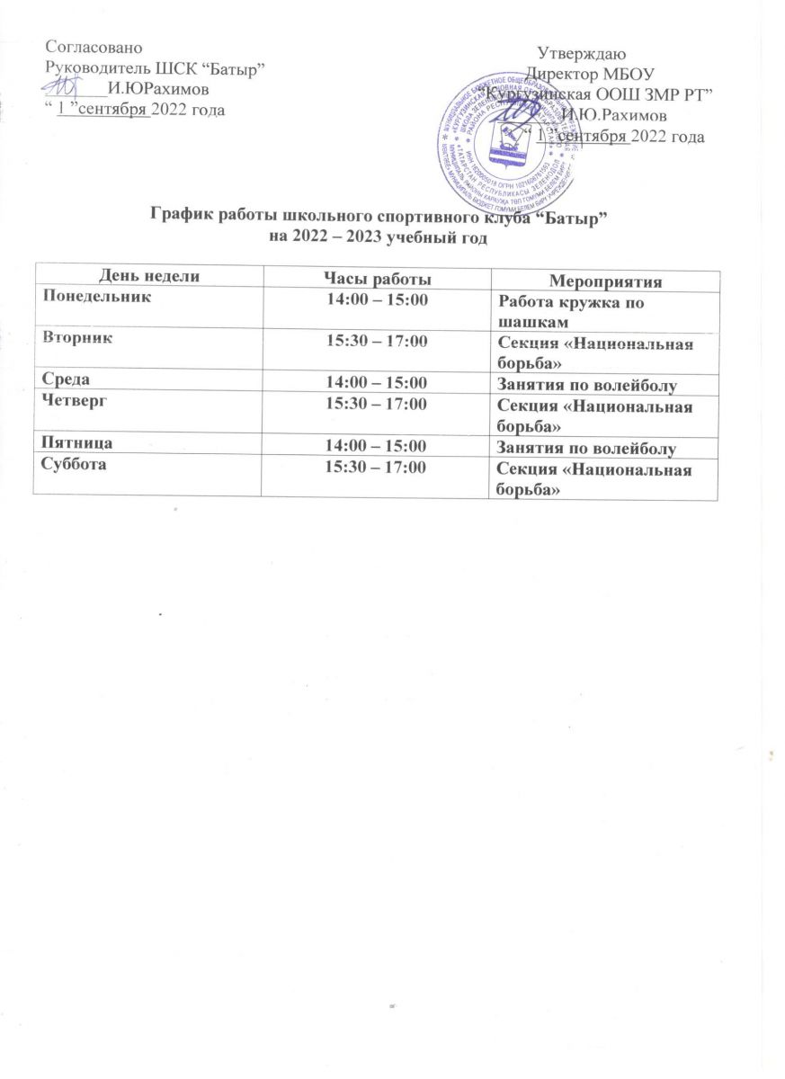 График работы школьного спортивного клуба “Батыр” на 2023 – 2024 учебный год
