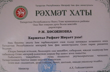 "Яшь буынны укыту һәм тәрбияләүдәге озак еллар нәтиҗәле хезмәтегез өчен ТР мәгариф һәм фән министрлыгы Сезгә тирән рәхмәтен белдерә. Югары һөнәри осталык, балаларга олы мәхәббәт, сабырлык, иҗади эзләнүләр һәм табышлар Сезне мәгариф өлкәсендә аерым бер шәхес итеп танытты ", - диелә хатта. Без Рифхәт Мәүлетовичны чын күңелебездән котлыйбыз һәм киләчәктә дә зур уңышлар теләп калабыз!!!