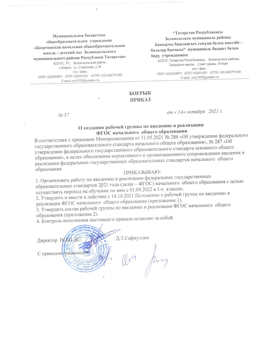 Приказ по школе "О создании рабочей группы по введению и реализации ФГОС НОО"