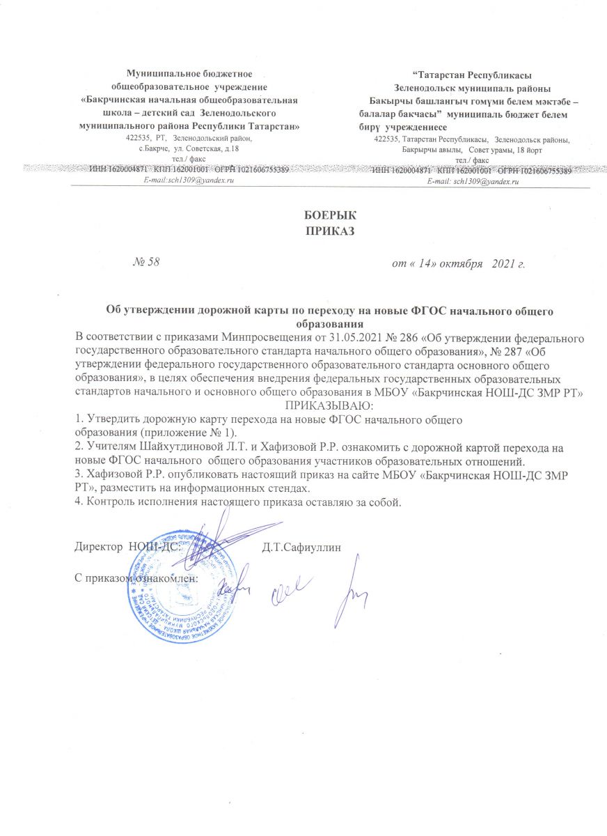 Приказ по школе "Об утверждении дорожной карты по переходу на новые ФГОС НОО"