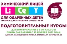 15 ноября 2021 года в 17.00 в лицее-интернате для одаренных детей с углубленным изучением химии - филиале ФГБОУ ВО «КНИТУ» состоится организационное собрание на тему «Подготовительные курсы к вступительным испытаниям в лицей».