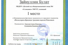 Муниципальный фестиваль традиционного народного творчества «Фольклорно-обрядные традиции народов Поволжья»/ «Идел буе халыкларының традицион гореф-гадәтләре» муниципаль халык иҗаты фестивале 12.04.2021 Воспитанник нашего детского сада Зайнуллин Булат занял 1 место! Молодец!!! Поздравляем!!!