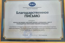 Сотрудничество/ Хезмәттәшлек 22.03.2021 Коллектив нашего детского сада за активное сотрудничество в деле подготовки профессиональных кадров в сфере образования с Зеленодольским филиалом КИУ им.Тимирясова (ИЭУП) награжден Благодарственным письмом.