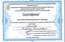 Межмуниципальный семинар «Билингвальное образование в поликультурной среде дошкольной образовательной организации»/ Районара семинар “Балалар бакчасында төрле культуралар мөхитендә билингваль белем бирү” 01.04.2021 Воспитатель Мокеева Альбина Дамировна, приняла участие в семинаре и получила сертификат.