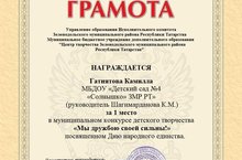 Конкурс детского творчества «Мы дружбою своей сильны!»/ Балалар иҗаты конкурсы «Без дуслык белән көчле!» 29.11.2020 Организаторы конкурса, посвященного Дню народного единства «Центр творчества ЗМР РТ».Поздравляем, воспитанницу нашего детского сада Гатиятову Камиллу и воспитателя высшей квалификационной категории Шагимарданову Куляш Минахметовну с победой 1 место. Молодцы!!! Спасибо организаторам.