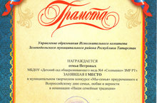 Муниципальный конкурс «Мы-семья»/ «Без-гаилә " муниципаль конкурсы 14.07.2023 В рамках Всероссийского праздника «Дня семьи, любви и верности» воспитанники нашего детского сада совместно с родителями приняли активное участие в муниципальном конкурсе «Мы-семья» по итогам конкурса семья Петровых и семья Переведенцевых заняли 1 место, семья Никитиных 3 место. Поздравляем!!! Молодцы!!!Спасибо организаторам.