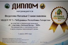 "Зеленая Весна-2019" 19.07.2019 За активное участие в творческом конкурсе " Я - участник Зеленой Весны-2019" за инициативу и значимый вклад в дело охраны окружающей среды педагоги детского сада были награждены дипломами Экологического фонда имени В.Н. Вернадского.