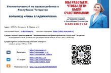 Каждый из Вас имеет права. Ваши дети находятся под защитой государства, они тоже имеют права. Права детей закреплены в Законе «О правах ребёнка». Но только разумное сочетание прав и обязанностей делает человека счастливым. По всем вопросам нарушения прав вашего ребенка вы можете обратиться к Уполномоченному по правам ребенка в Республике Татарстан ВОЛЫНЕЦ ИРИНЕ ВЛАДИМИРОВНЕ. Адрес: 420015,г. Казань,ул. К. Маркса, д. 61 электронный адрес: rt.deti@tatar. ruинтернет-приемная: https://rtdety.tatarstan.ru/ График личного приема граждан Уполномоченным по правам ребенка в Республике Татарстан: по вторникам с 14.00 до 18.00 (по предварительной записи по тел. (843) 236-61-64). График приема граждан сотрудниками Аппарата: каждую среду с 9:00 до 18:00 ВКОНТАКТЕ: https://vk.com/upr_v_rt https://vk.com/irina_volinets Телеграм: https://t.me/upr_v_rt https://t.me/volynetsvkurse https://t.me/volinets_team