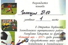 Футбольную команду гимназии - Победителей в открытом первенстве ЗМР РТ по футболу «Кожаный мяч – 2017» среди учащихся школ города Зеленодольска и Зеленодольского района 2004-2005 г. р. Гордимся вами!
