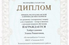 Ученицу 9 класса Хайрутдинову Э. - призёра Республиканской олимпиады по родному (татарскому) языку! Подготовила Хайрутдинову Э. учитель родного (татарского) языка Назмутдинова М.Л.