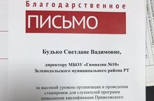 За высокий уровень организации и проведения стажировок для слушателей программ повышения квалификации Приволжского межрегионального центра повышения квалификации и профессиональной переподготовки работников образования КФУ благодарственные письма, а также сертификаты вручены директору гимназии Светлане Вадимовне Будько, а также заместителям директора Ищейкиной М.К., Назмутдиновой М.Л., педагогам Четверкиной Н.В., Ореховой Л.П., Минуллиной В.В., Даниловой Т.Н.