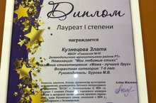 Поздравляем! Кузнецову Злату, ученицу 3В класса, победительницу Всероссийского фестиваля-конкурса «Star» в номинации «Мои любимые стихи». Молодец! Мы годимся тобой!