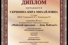 ПОЗДРАВЛЯЕМ! Скрипину Киру, ученицу 2 Г класса — победителя Всероссийского творческого конкурса «Майский праздник — День Победы» в номинации «Рисунок» (кл. руководитель Бурова М.В.). Молодец!!! Так держать!!