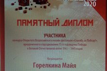 Поздравляем ученицу 2Г класса Горелкину Майю. — участницу Открытого Всероссйиского онлайн-фестиваля «Спасибо за Победу!», приуроченного к празднованию 75-ой годовщины Победы в Великой Отечественной войне.