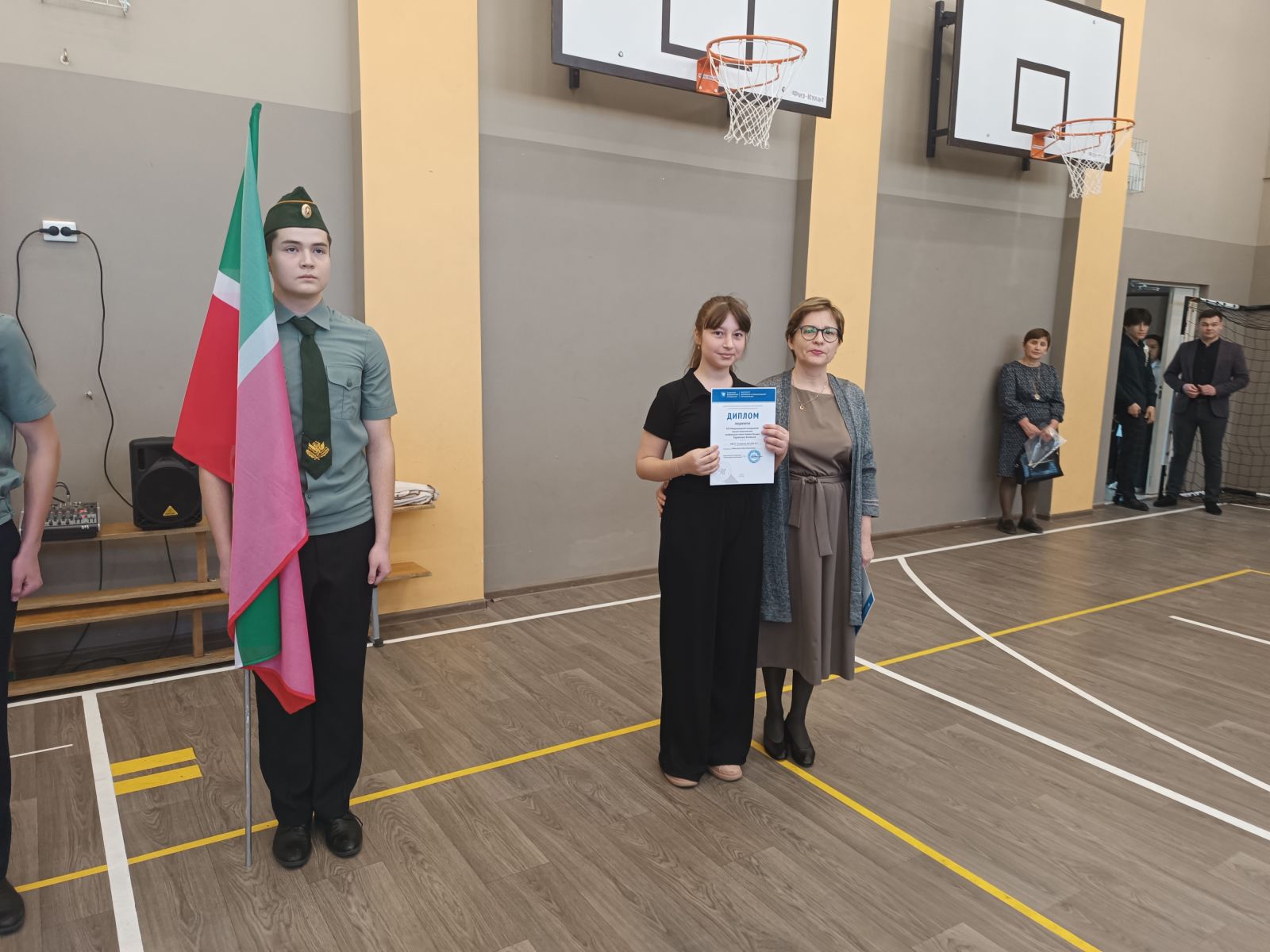 Бүген атналык Россия Федерациясе һәм Татарстан Республикасы флаглары күтәрү һәм гимнарын башкару чарасында укучыларга котлау дипломнары бирелде.